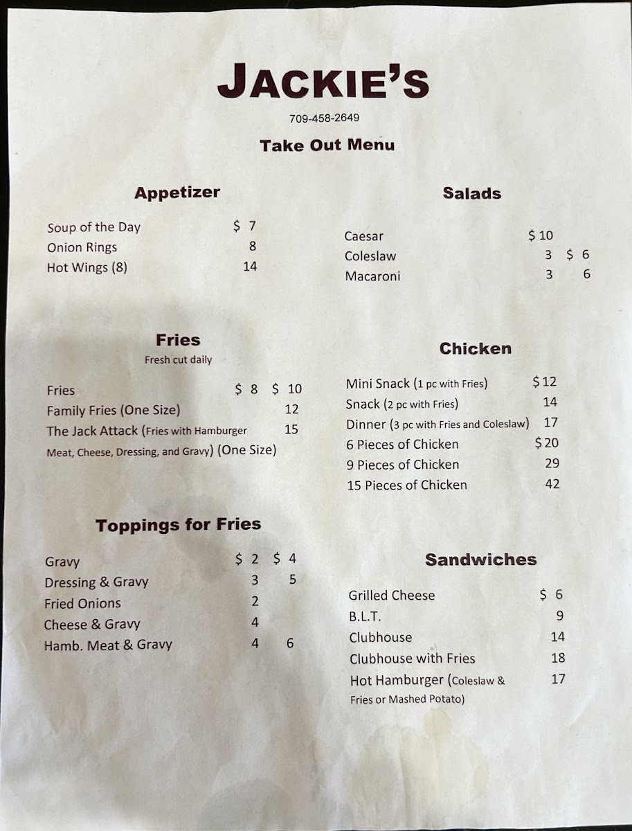 Nestled along Main St S in the picturesque town of Rocky Harbour, NL, Jackie's Takeout offers a down-to-earth dining experience that perfectly balances casual comfort with satisfying flavors. From the moment you step into this cozy spot, the relaxed, welcoming vibe makes it feel like a local secret you’re lucky to discover. The restaurant is designed with simplicity in mind, offering both counter and table service, making it easy whether you’re grabbing a quick bite or settling in for a relaxed meal. Parking is convenient, and the presence of clean, accessible restrooms adds a thoughtful touch to the overall experience.